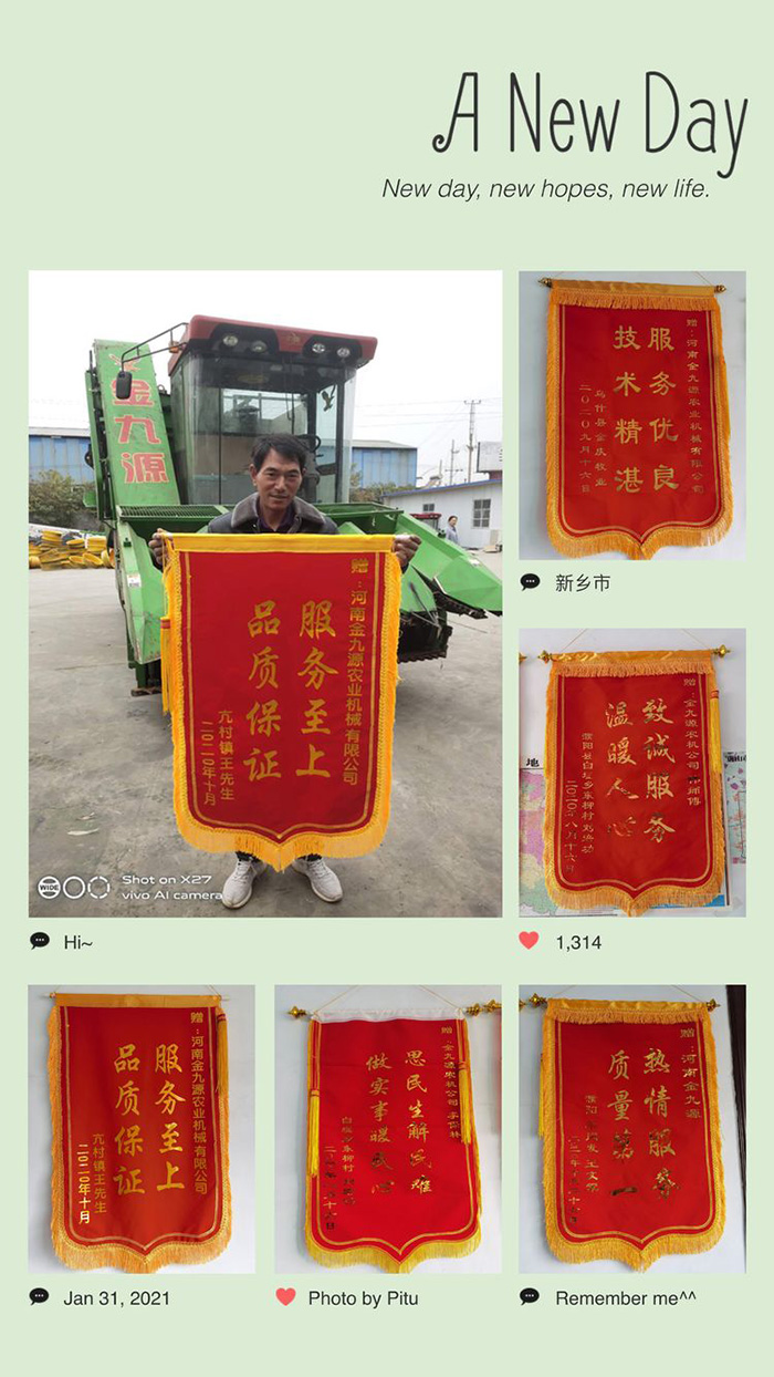 ? ? 2021牛年的腳步越來越近,河南金九源公司不負(fù)眾望,凝心聚力,傾情打造2021款穗莖兼收機(jī)!伴隨著公司成長(zhǎng)的腳步,我們承載著太多的期待。心存感激,永續(xù)前行,我們會(huì)不斷創(chuàng)新、提升自我、打造精品、塑造品牌,一路與您同發(fā)展,共進(jìn)步,服務(wù)無止境,真情到永遠(yuǎn)!